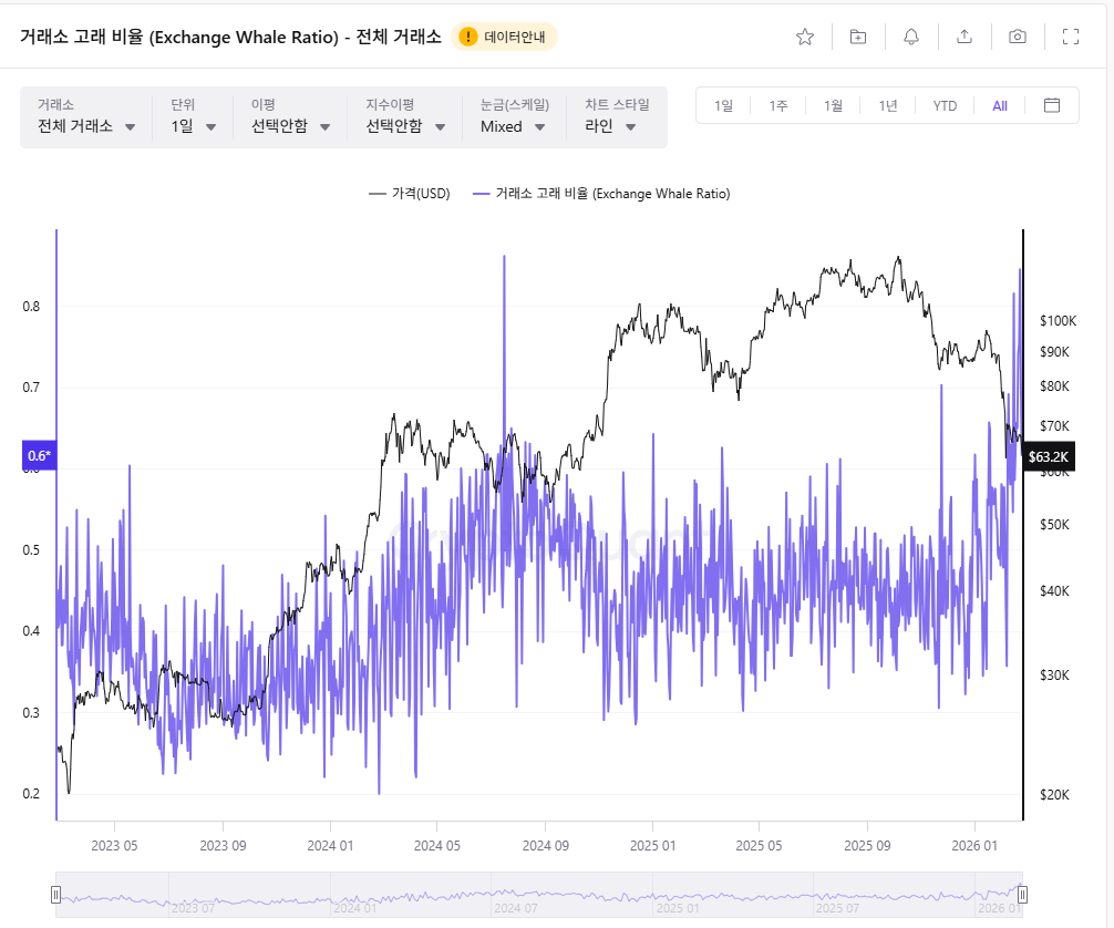 더 우려스러운 것은 크립토퀀트(CryptoQuant)가 집계하는 거래소 고래 비율(Exchange Whale Ratio)입니다. 이 지표는 전체 거래소 유입 중 상위 10개 입금 거래가 차지하는 비중을 나타내며, 기관이나 대형 고래의 매도 의지를 가늠하는 핵심 온체인 시그널입니다. 2월 현재 이 수치는 0.64로, 2015년 10월 이후 약 11년 만에 가장 높은 수준을 기록했습니다. 달리 말하면, 거래소로 들어오는 비트코인의 64%가 단 10개의 대형 거래에서 비롯된 것입니다.